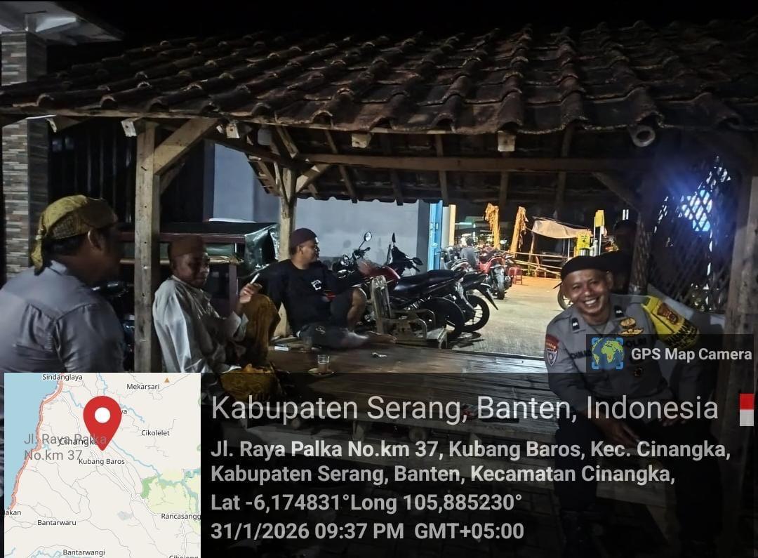 *Polres Cilegon* || Personil Bhabinkamtibmas Polsek Cinangka melaksanakan Program Komandan Wish Kapolda Banten RONDA SATKAMLING menyampaikan komunikasi dengan Petugas Siskamling agar berperan aktif dalam menciptakan Harkamtibmas yang aman dan Kondusif, Minggu (01/02/2026).