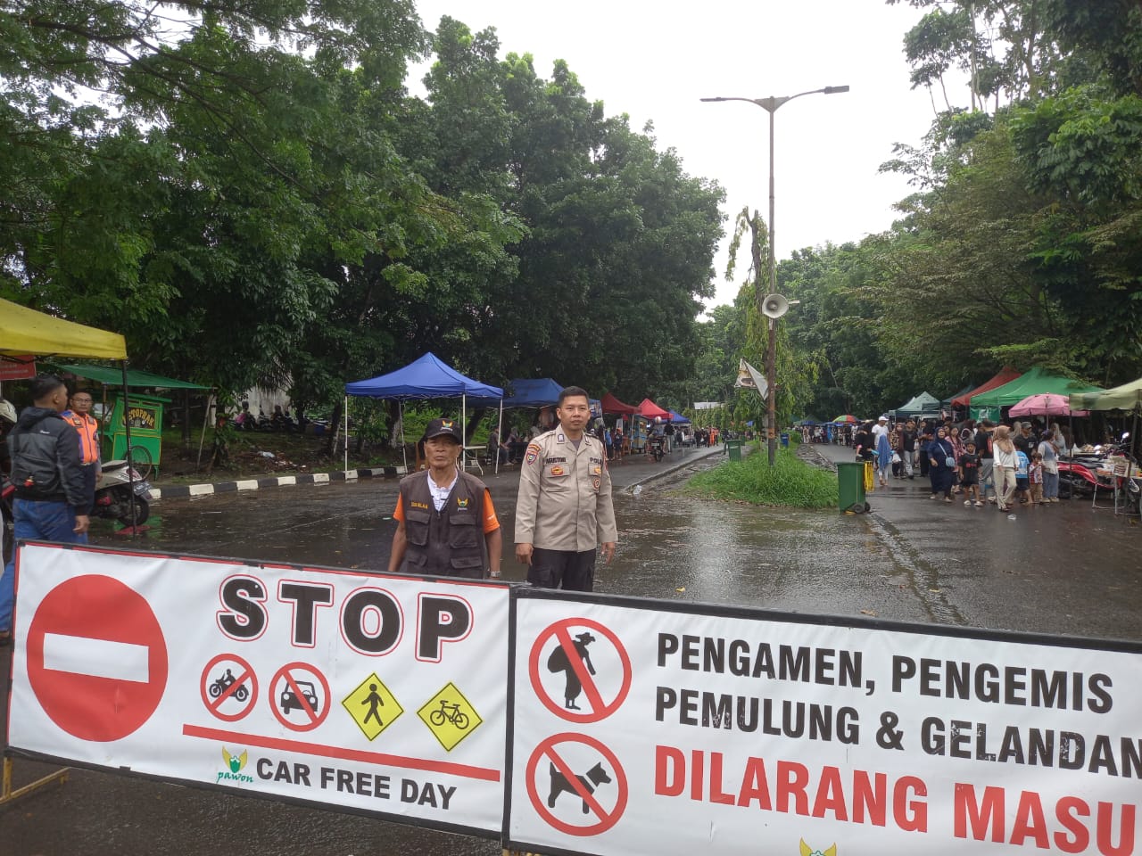 personel Polri sedang mengatur akses jalur dengan menggunakan spanduk penutup jalan bertuliskan "STOP" beserta rambu larangan berkendara. Unit mobil patroli Polisi juga ditempatkan di lokasi untuk mendukung pengamanan. Di bawah kanopi kuning, beberapa warga terlihat berkumpul dengan membawa kendaraan roda dua, sementara sekitar lokasi dikelilingi oleh pepohonan rindang yang memberikan kenyamanan pada suasana acara. Permukaan jalan tampak sedikit basah, kemungkinan akibat cuaca yang baru saja hujan.