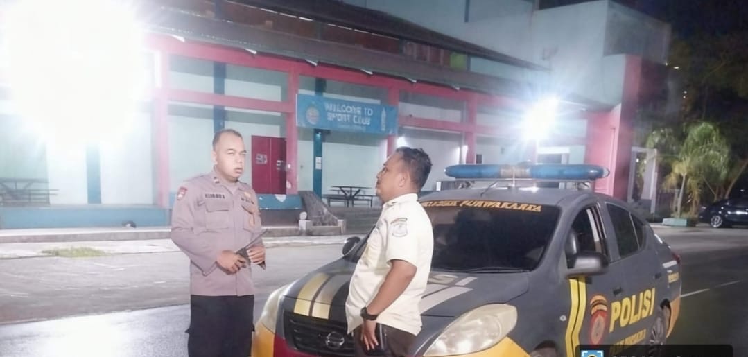 terlihat satu unit kendaraan patroli berada di sisi jalan dengan petugas yang sedang memantau sekitar. Permukaan jalan tampak basah dan licin, kemungkinan akibat hujan yang pernah turun sebelumnya. Pencahayaan di lokasi cukup terbatas, namun lampu jalan yang tersebar membantu menjaga visibilitas pada malam hari.