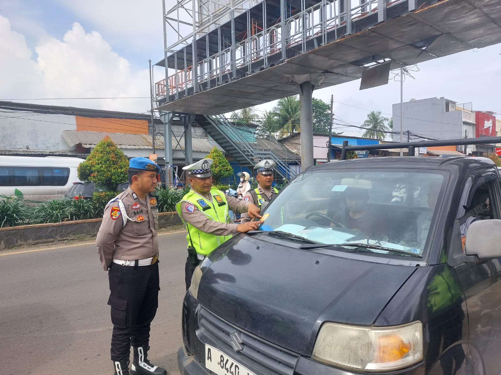 Petugas Sat Lantas Polres Cilegon memberikan edukasi langsung kepada masyarakat terkait pentingnya mematuhi peraturan lalu lintas, menggunakan helm SNI, melengkapi surat-surat kendaraan, serta mengutamakan keselamatan dalam berkendara.