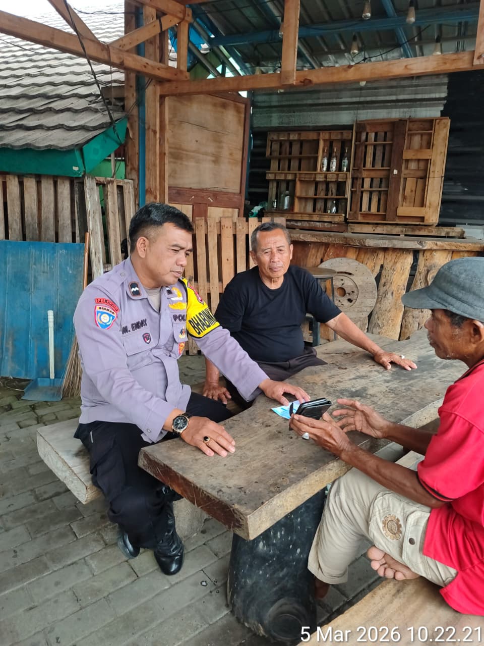 Cilegon - Guna mencegah gangguan kamtibmas, Personil Polsek Ciwandan Polres Cilegon Polda Banten melaksanakan giat Patroli dialogis dipangkalan Ojek (Opang) Pertigaan Simpang Warnasari Kelurahan Kebonsari kecamatan Citangkil, Kamis (05/03/2026).
