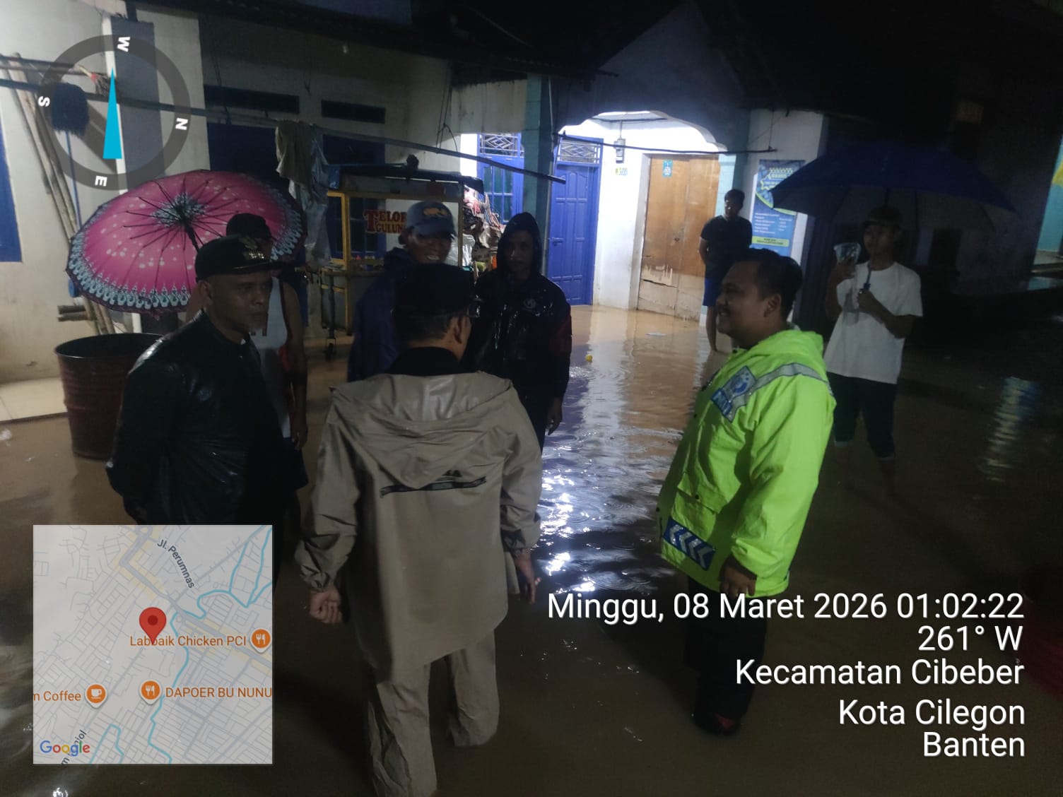 Genangan air diperkirakan setinggi 30 cm mengakibatkan banyak rumah warga yang tergenang. Anggota Polsek Cibeber Polres Cilegon berserta Camat Cibeber dan dibantu dengan warga sekitar melakukan patroli genangan air terhadap warga terdampak genangan apabila ada yang perlu di evakuasi.