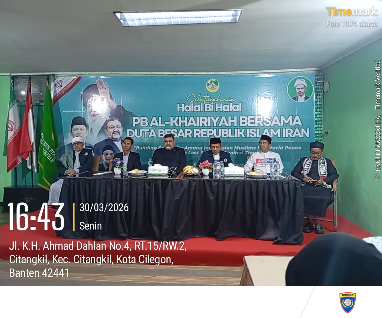 Cilegon - Bhabinkamtibmas Kelurahan Citangkil Polsek Ciwandan Polres Cilegon Polda Banten AIPDA Warudin, menghadiri kegiatan Halal Bihalal PB Alkhairiyah bersama Duta Besar Republik Islam Iran, MUMAMMAD BOROUJERDI, dan tim di Aula PB Alkhairiyah, Citangkil, Senin (30/03/2026).