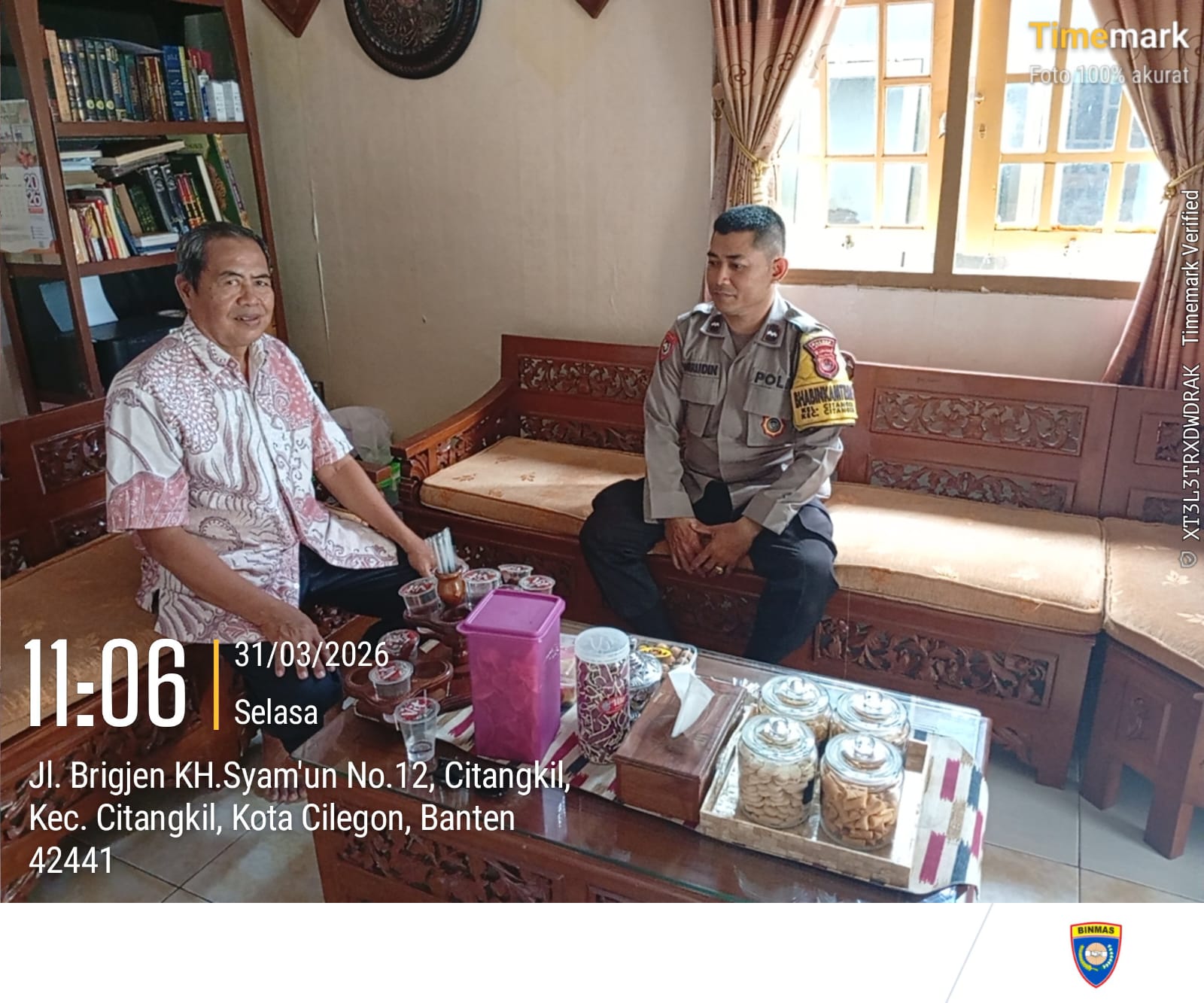 Cilegon - Giat sambang ini merupakan salah satu tugas rutin Bhabinkamtibmas yakni dengan melaksanakan kunjungan kepada warga masyarakat binaannya untuk menjalin silaturahmi yang lebih erat dan menyampaikan pesan-pesan kamtibmas serta mencari informasi yang berkembang di masyarakat agar tercipta situasi kamtibmas yang aman dan kondusif, Selasa (31/03/2026).