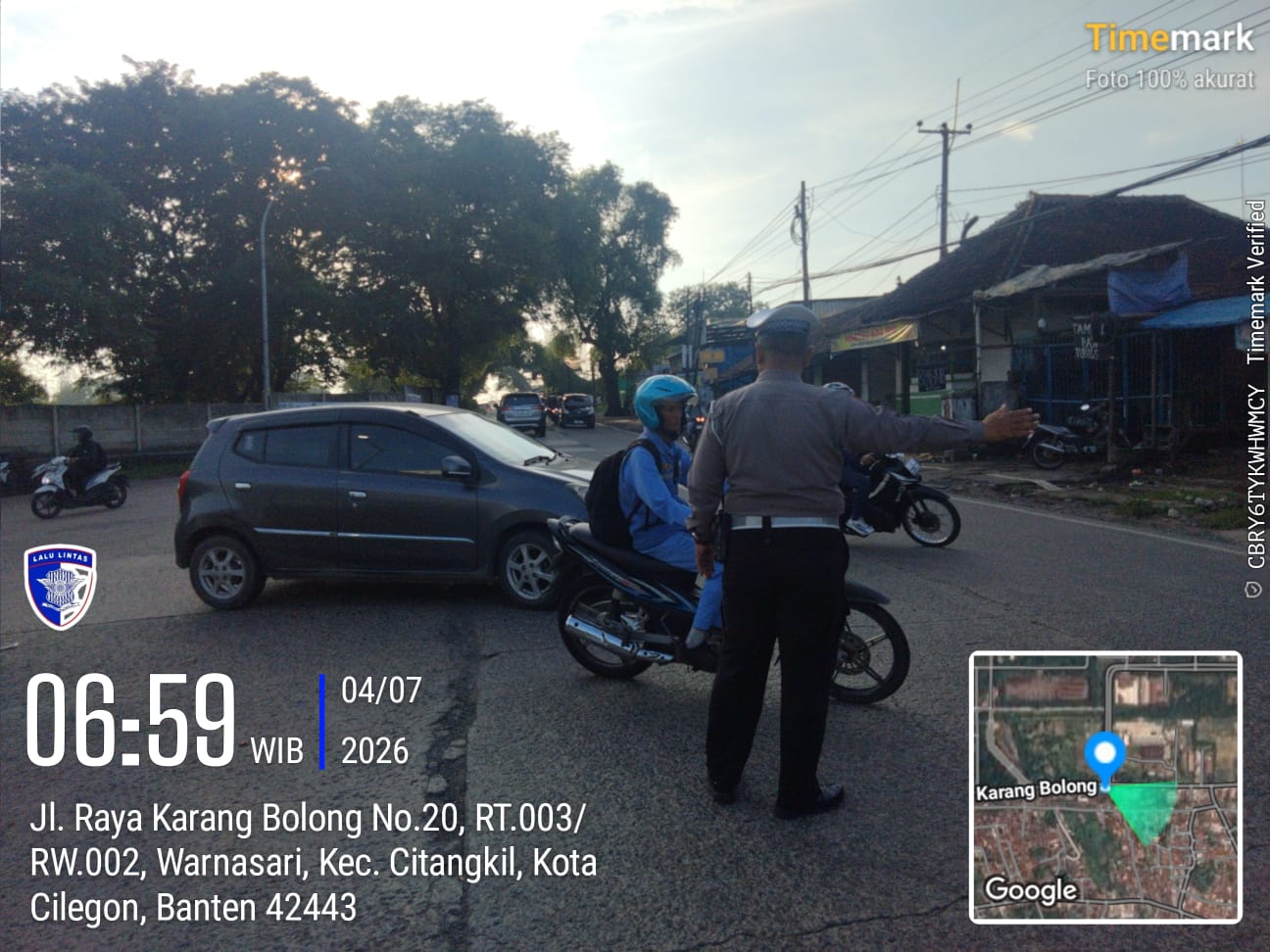 Cilegon - Guna Kelancaran Lalu-lintas Personil Unit Lantas Polsek Ciwandan Polres Cilegon Polda Banten melaksanakan pengaturan lalu-lintas di Simpang Beringin Ciwandan Pertigaan Kawasan Industri KSP/ KIEC I kelurahan Warnasari Kecamatan Citangkil Kota Cilegon, Selasa (07/04/2026).