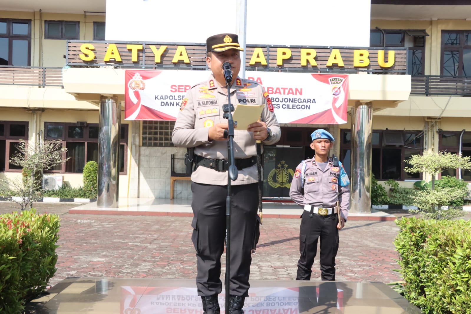Cilegon - Kapolres Cilegon AKBP Dr. Martua Raja Taripar Laut Silitonga S.H S.IK M.S.I, memimpin langsung upacara pengangkatan dan serah terima jabatan (sertijab) tiga kapolsek di jajaran Polres Cilegon Polda Banten, kapolsek Kp Banten,Kapolsek Bojonegara dan Kapolsek Puloampel, selasa ,14/4/26